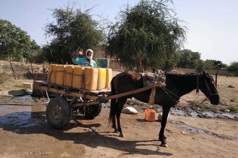 We see how on the paths along the road, groups of women move on the backs of donkeys laden with jerry cans.